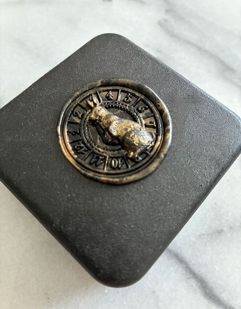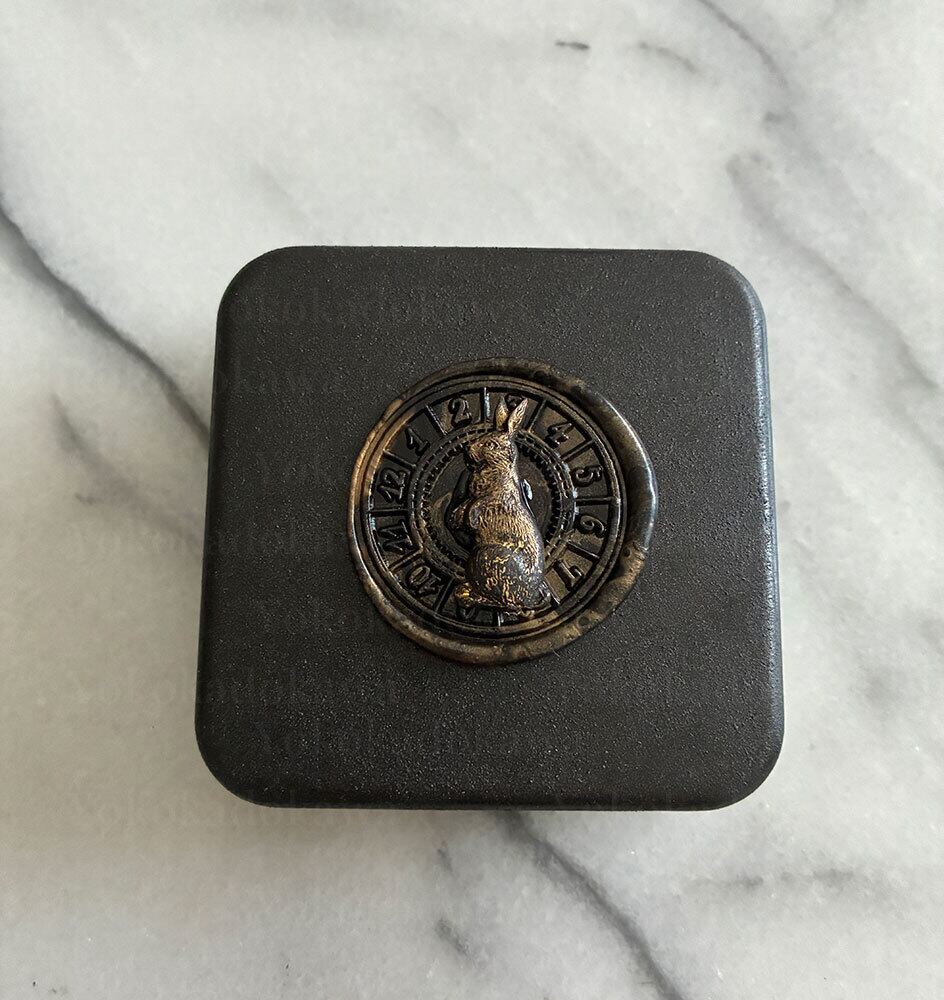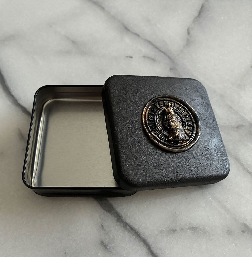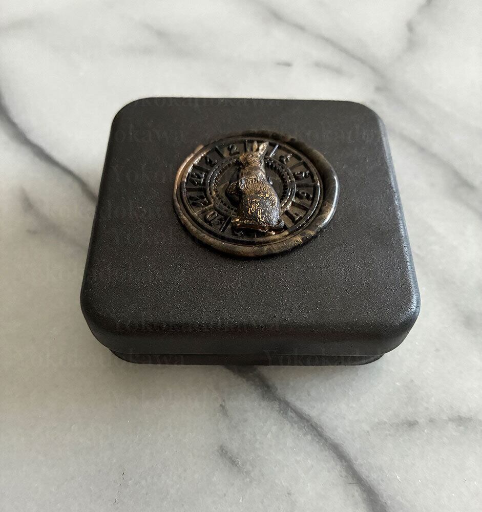 缶にペイントし真鍮パーツとシーリングスタンプをあしらいました。