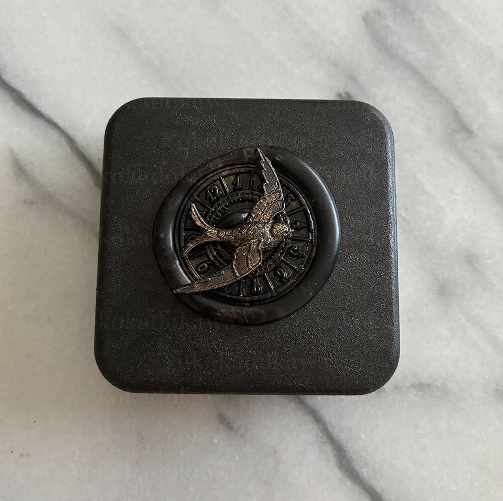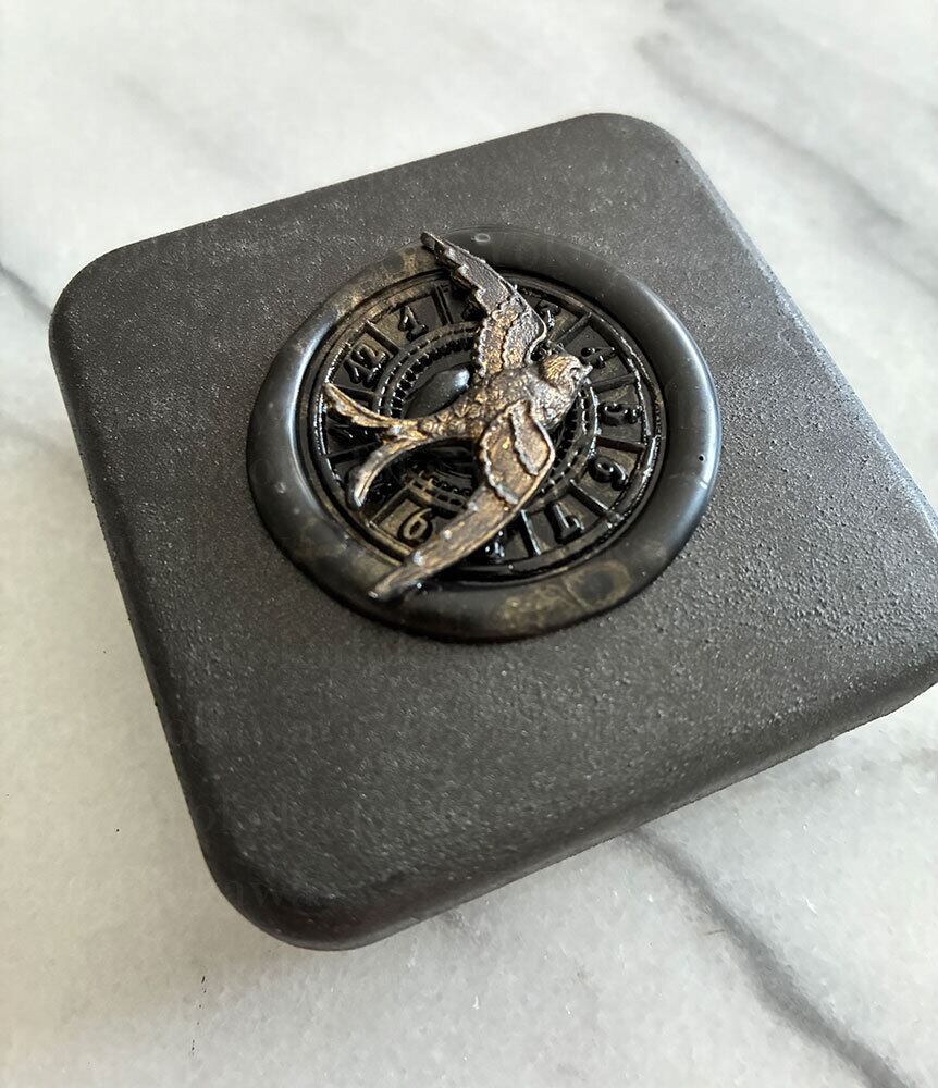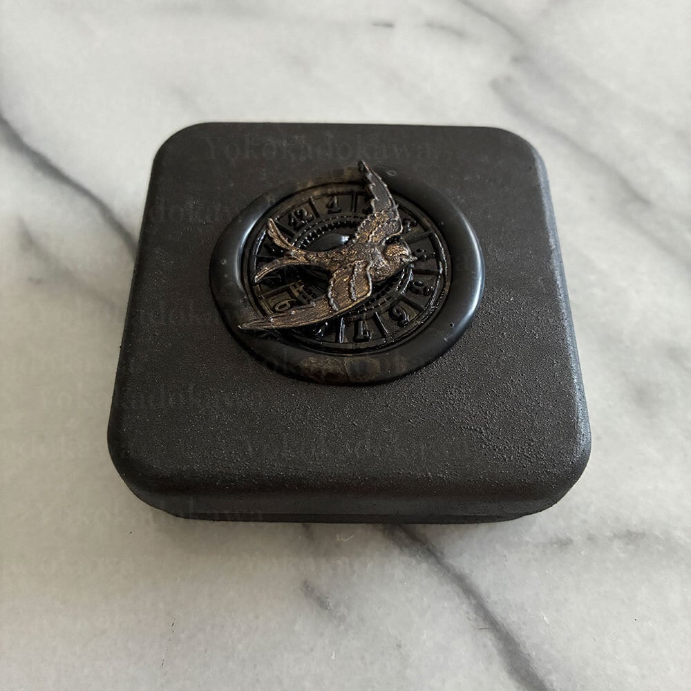 缶にペイントし真鍮パーツとシーリングスタンプをあしらいました。