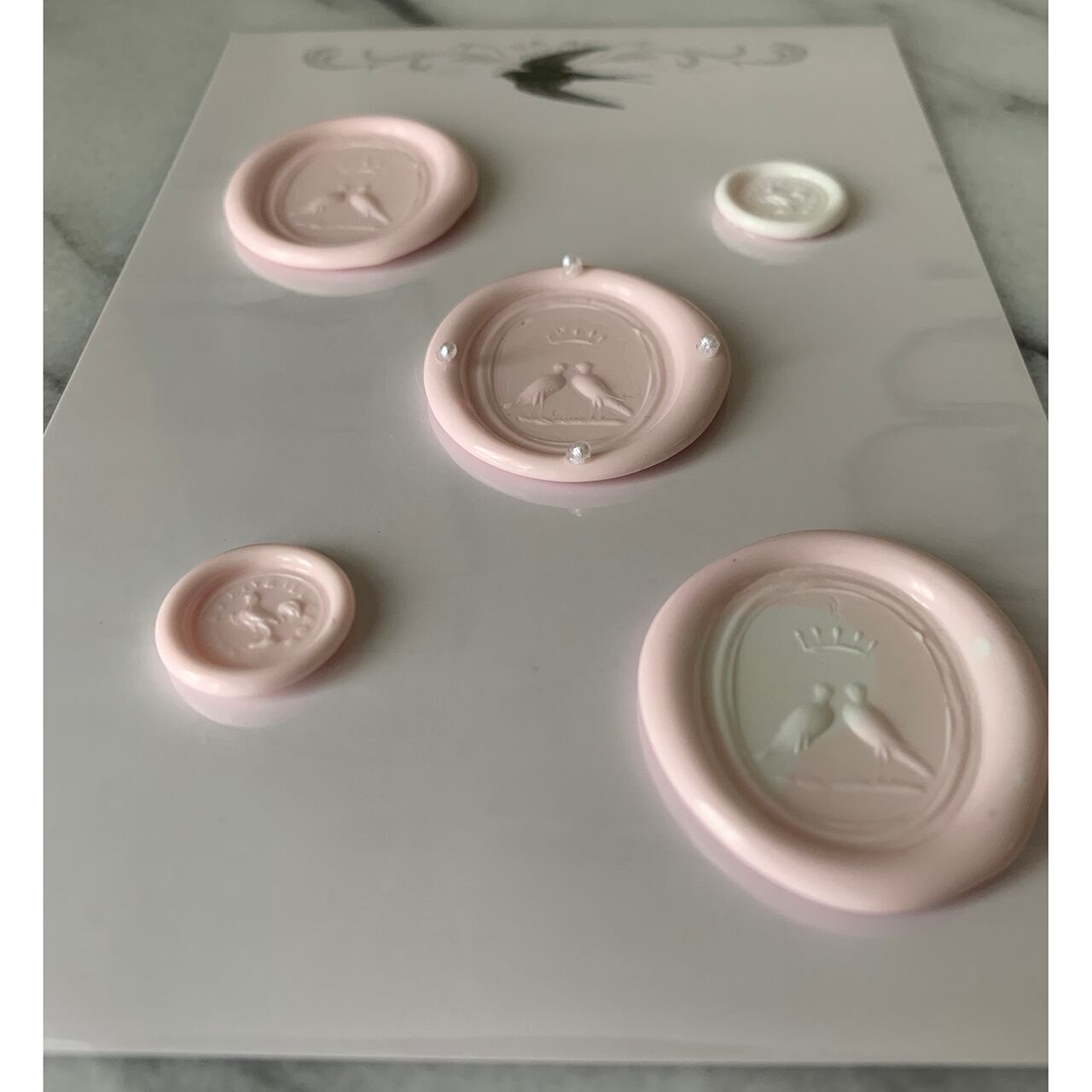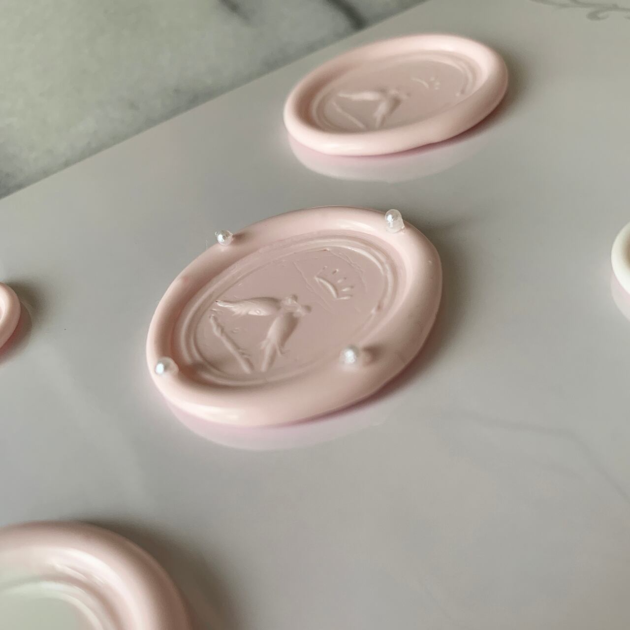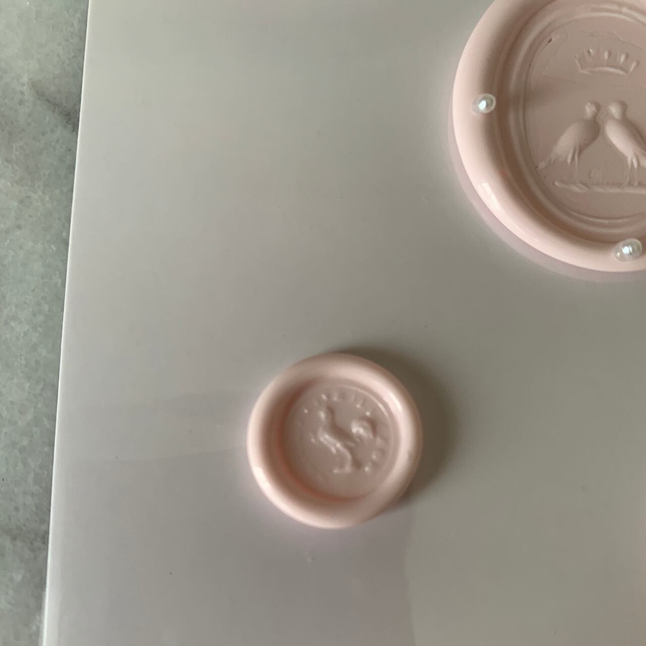 薄い ピンクと白のシーリングワックスを使って可愛らしいイメージのワックススタンプにしました。